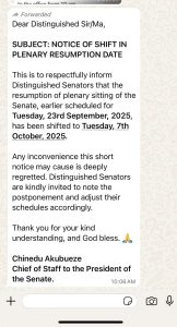 Sources close to the senator stated that screenshots of the midnight directive have been forwarded to Vice President Kashim Shettima and will also be sent to President Bola Ahmed Tinubu for action. Critics argue that if unchecked, the Senate President’s family could wield undue influence over parliamentary procedures.