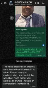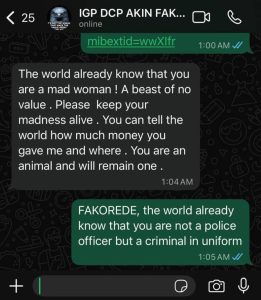 The plot twist, according to Mgbeke, came when she personally “tracked my case file straight to his table” after Fakorede had allegedly denied any knowledge of it on a three-way call. This confrontation, she claims, prompted the now-viral WhatsApp insults from the Commissioner of Police.