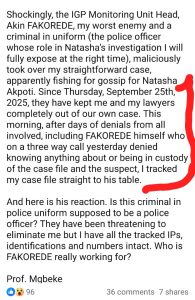 Shockingly, the IGP Monitoring Unit Head, Akin FAKOREDE, my worst enemy and a criminal in uniform (the police officer whose role in Natasha’s investigation I will fully expose at the right time), maliciously took over my straightforward case, apparently fishing for gossip for Natasha Akpoti. Since Thursday, September 25th, 2025, they have kept me and my lawyers completely out of our own case. This morning, after days of denials from all involved, including FAKOREDE himself who on a three way call yesterday denied knowing anything about or being in custody of the case file and the suspect, I tracked my case file straight to his table.