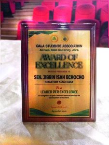 The Ahmadu Bello University (ABU), Zaria chapter of the Igala Students Association (ISA) has honoured Senator Jibrin Isah Echocho, representing Kogi East Senatorial District, with the award of “Leader Per Excellence” for his outstanding contributions to youth development and public service.